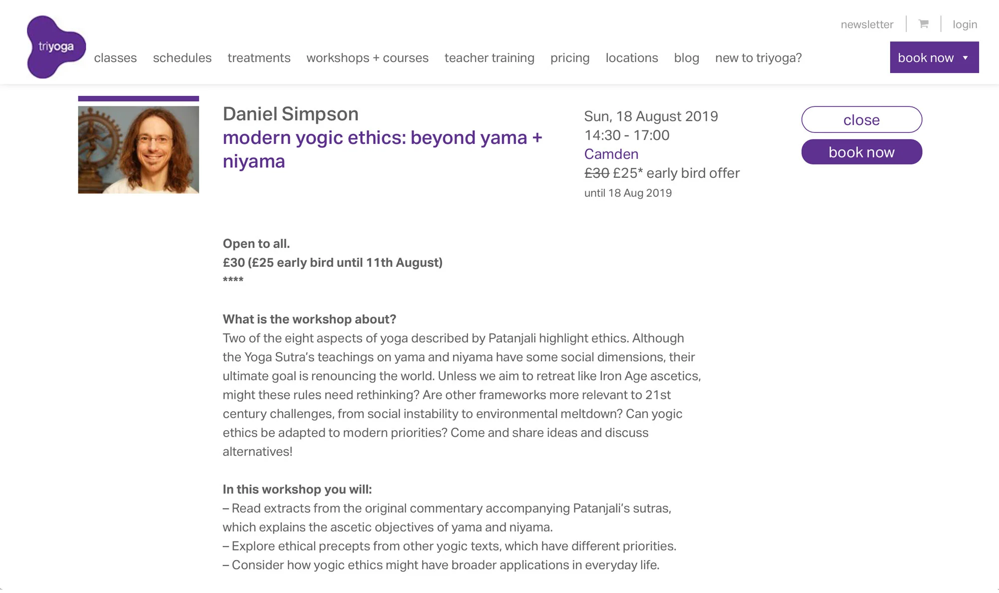 The workshop is open for booking at triyoga.co.uk. It costs £30, or £25 if you book before 11 August. There’s also a special summer offer: bring a friend and get a 20% discount.