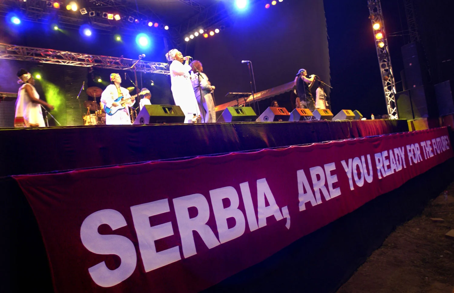 A vast red banner still hangs outside the ruined 18th-century fortress beside the Danube where the festival took place. "Serbia, are you ready for the future?" it asks of anyone who approaches. The slogan is plastered all over the site and on billboards across the country.
