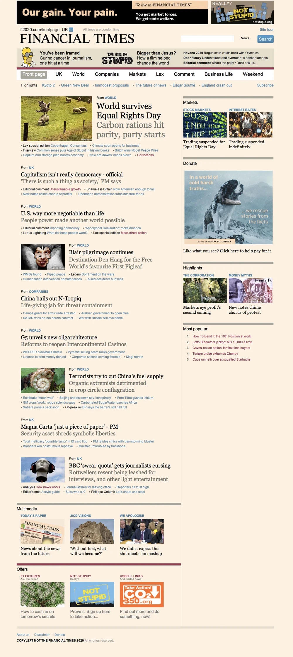 "Journalists frame public debate, and the City frames public policy," said Raoul Djukanovic, who edited today's fake FT. "If they reframed their thinking, they could help build a different world instead of conning us with lifestyle porn and bubbles."